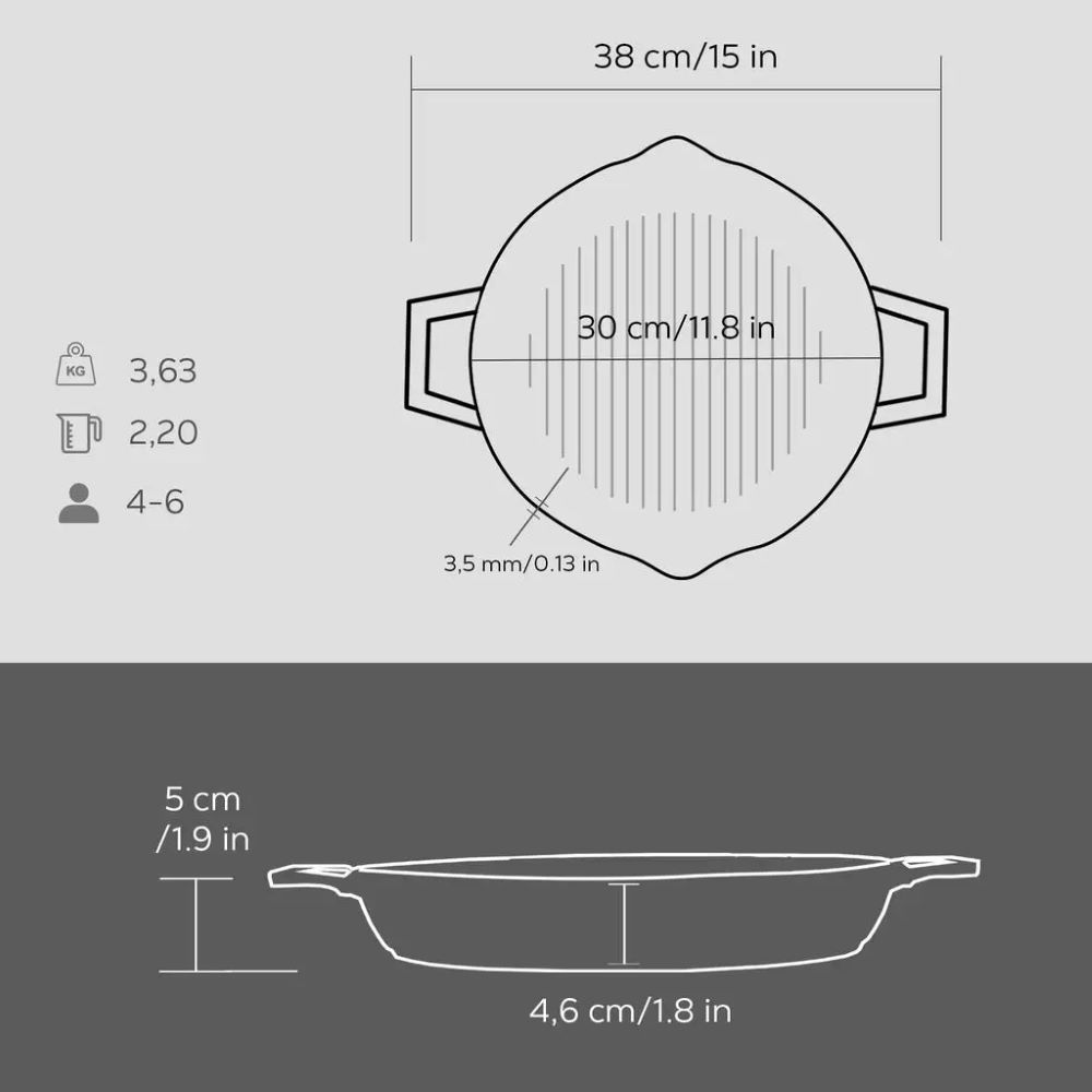 A grill serpenyő falai 3,5 mm vastagok, és belsejében a terméket egy fekete zománcréteggel bevonják, amely megkönnyíti a tapadásmentes felület kialakulását zsírral történő főzéskor.