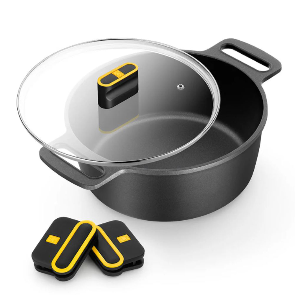 Ultra ellenálló felülettel rendelkezik, a fogantyúk pedig biztonságos és kényelmes fogást biztosítanak. Mind a szilikon fogantyúk, mind az üvegfedél bakelit gombja fekete, sárga részletekkel, amelyek a Daily Pro kollekcióra jellemző elemek.