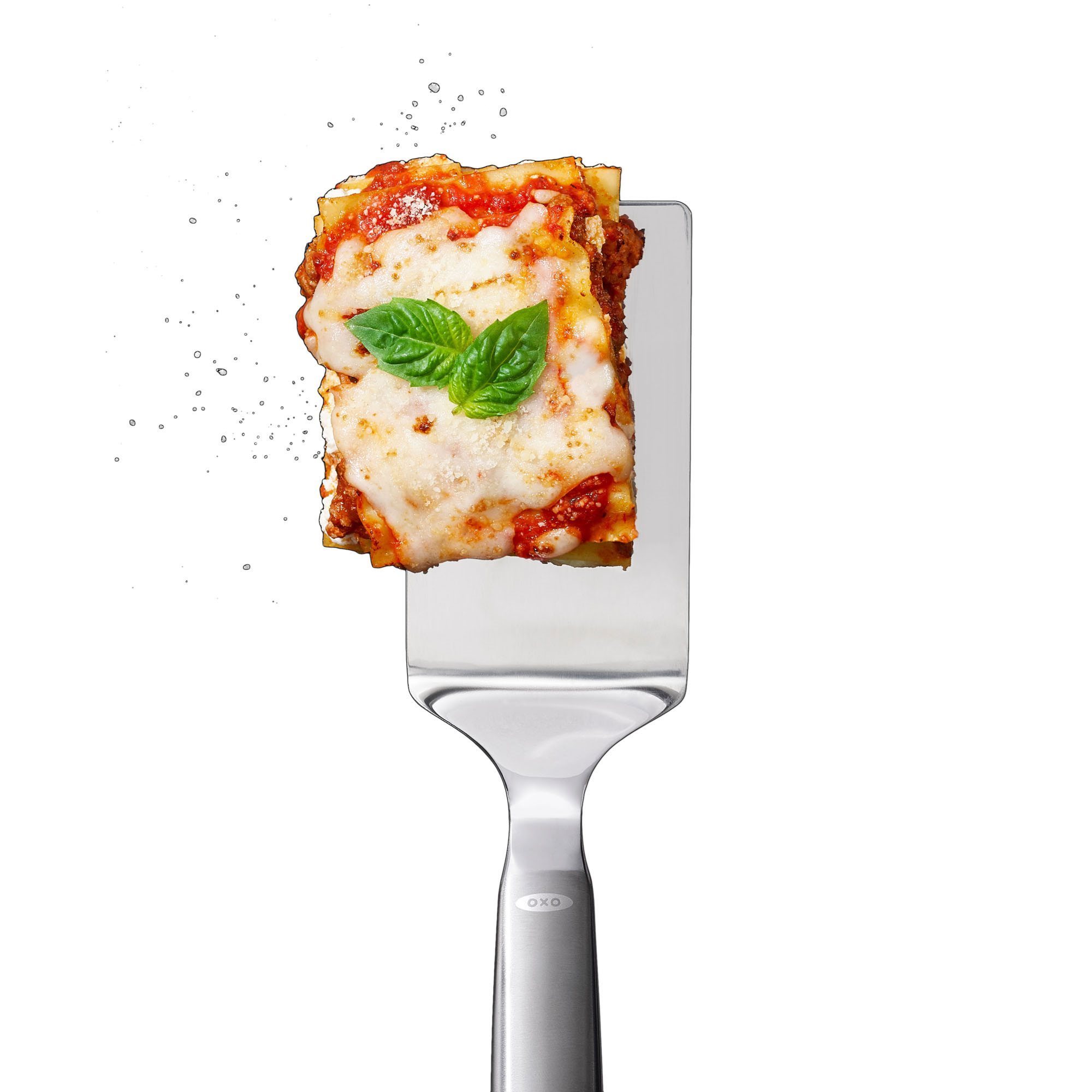 Ez a rozsdamentes acélból készült OXO Steel lasagna tálaló spatula mind a lasagna elkészítésében, mind a tálalásában hasznos. Ezenkívül a spatula segíthet quiche és brownie felszolgálásában, hamburgerek és zöldségek megfordításában és még sok másban.