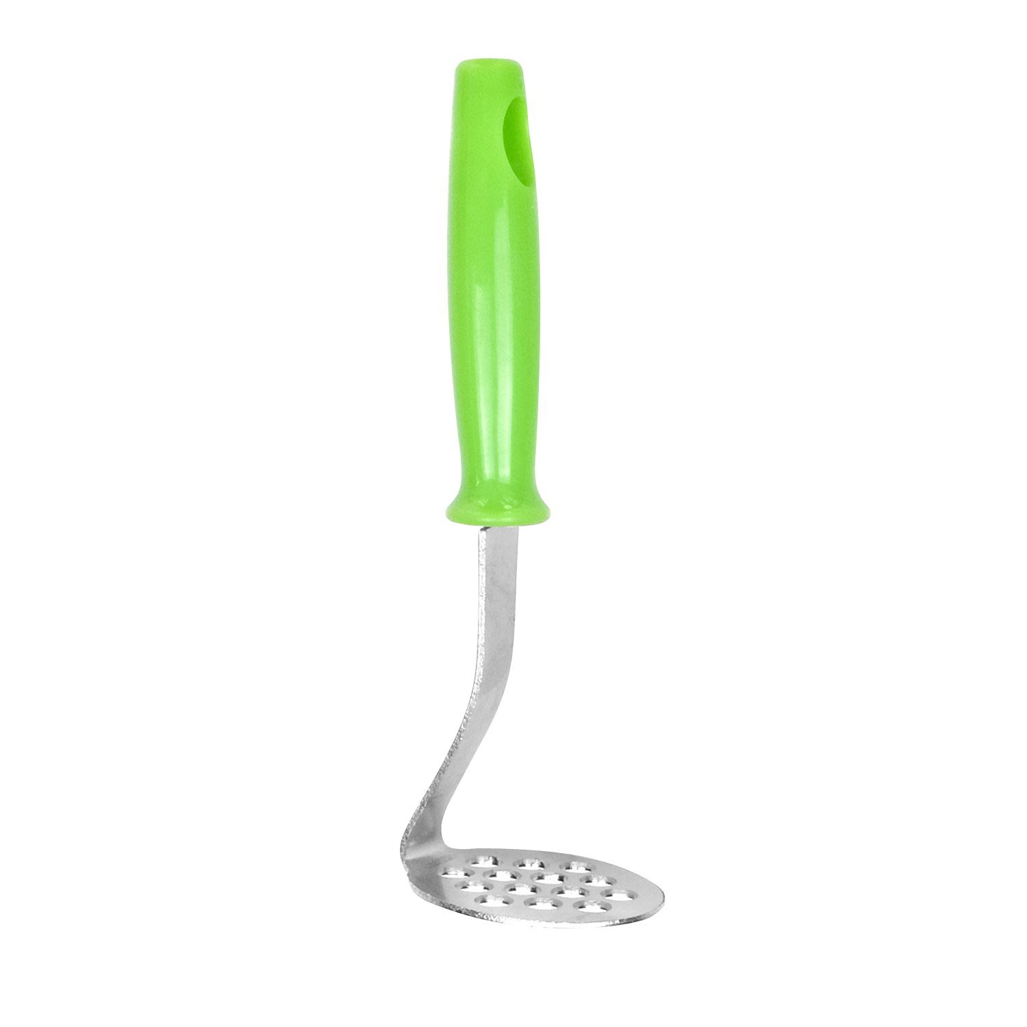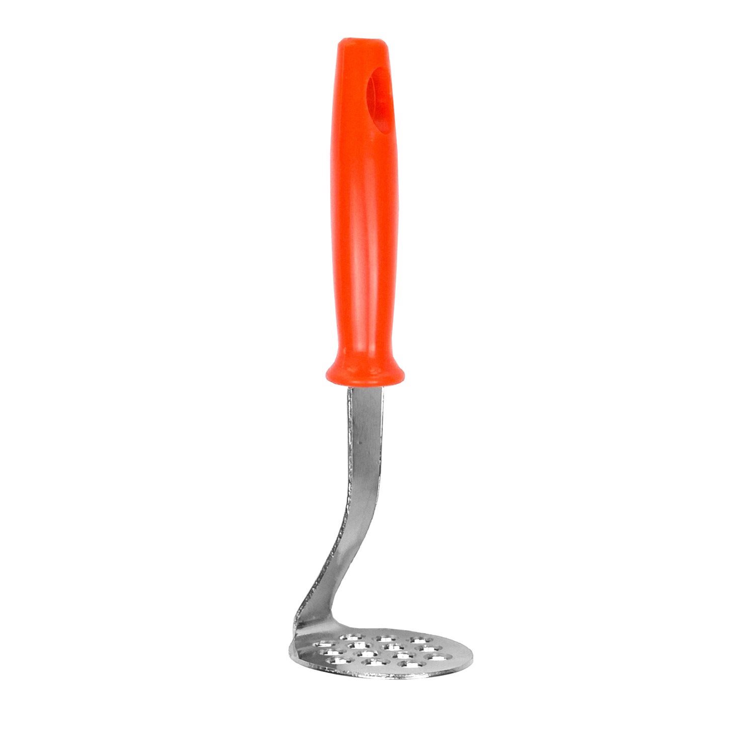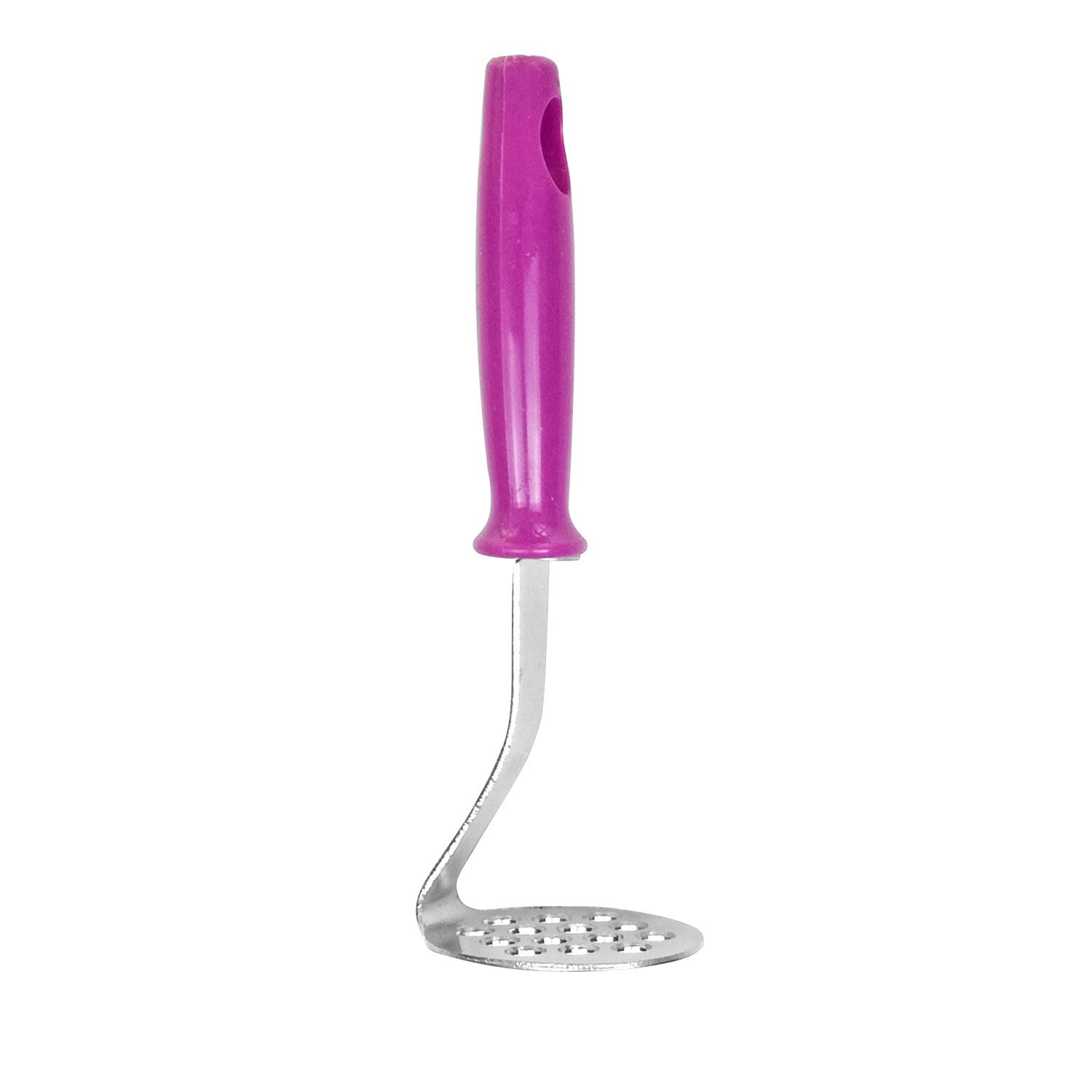 Mini krumplitörő, 17 cm hosszú, színes műanyag fogantyúval, rozsdamentes acél véggel és akasztógyűrűvel.