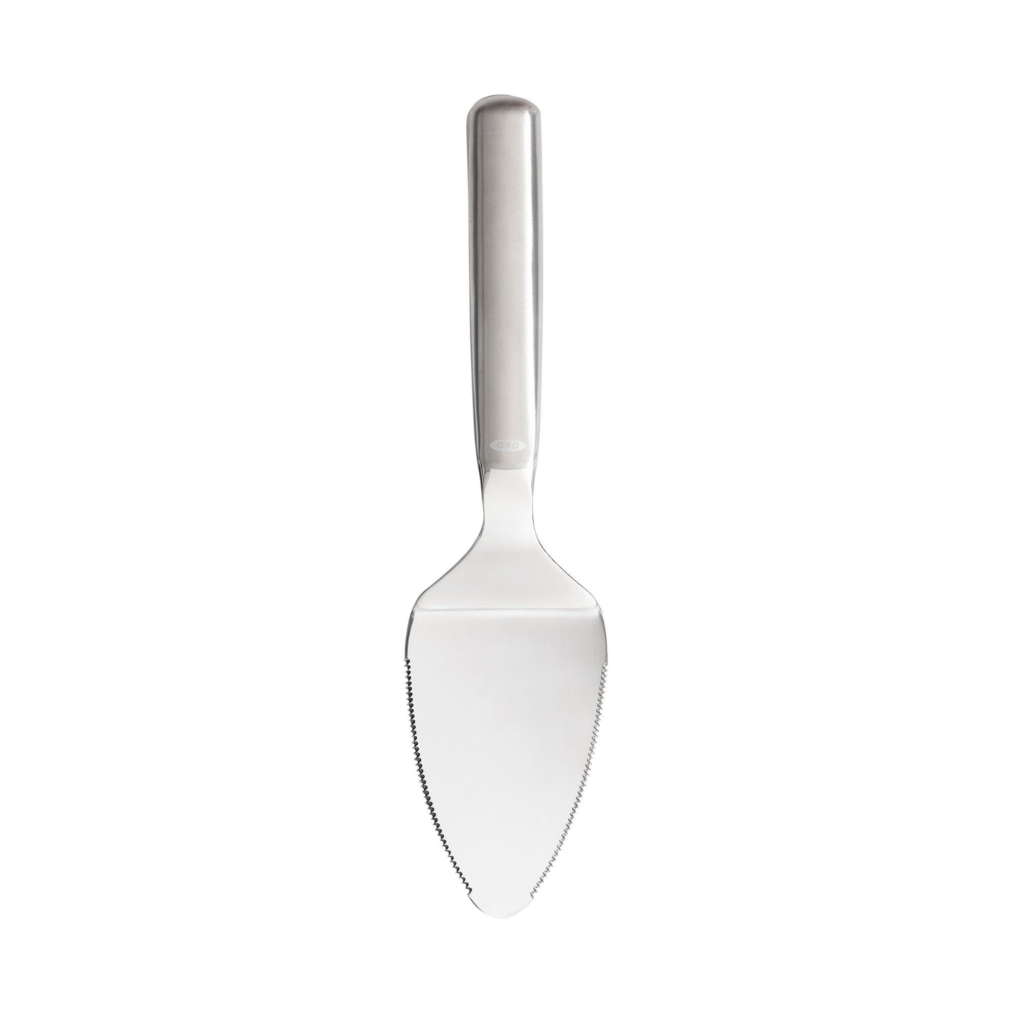 Miután minden erőfeszítést megtett egy finom pite elkészítéséhez, már csak a tepsiből a desszert tányérokra kell helyeznie, és itt jön be az OXO Steel pite tálaló spatula. A spatula mindkét oldalán fogazott élekkel rendelkezik. gyors szeletelés, valamint a tartós, mégis rugalmas rozsdamentes acél hegy, amely könnyen becsúszik a törékeny élelmiszerek alá. A fogantyú ugyanolyan kényelmes, mint elegáns.