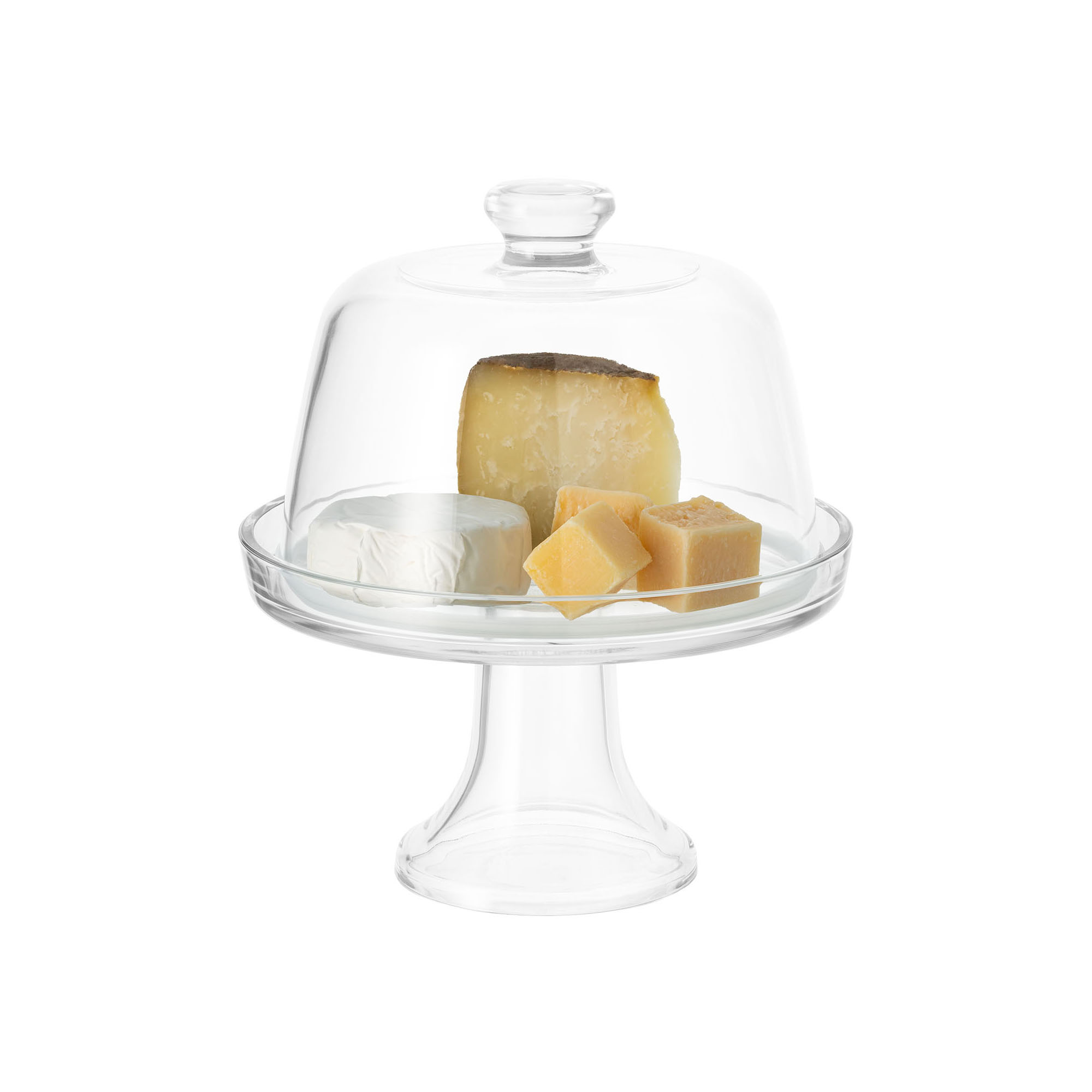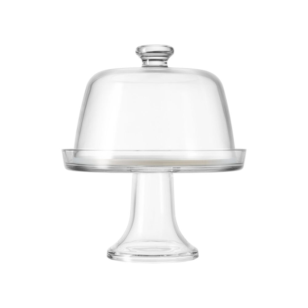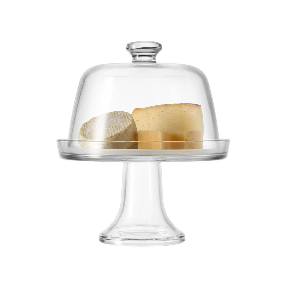 Lábú tál kupola típusú fedéllel, Borgonovo márka, átmérője 22 cm, üvegből készült, sajtok kiszolgálására alkalmas.