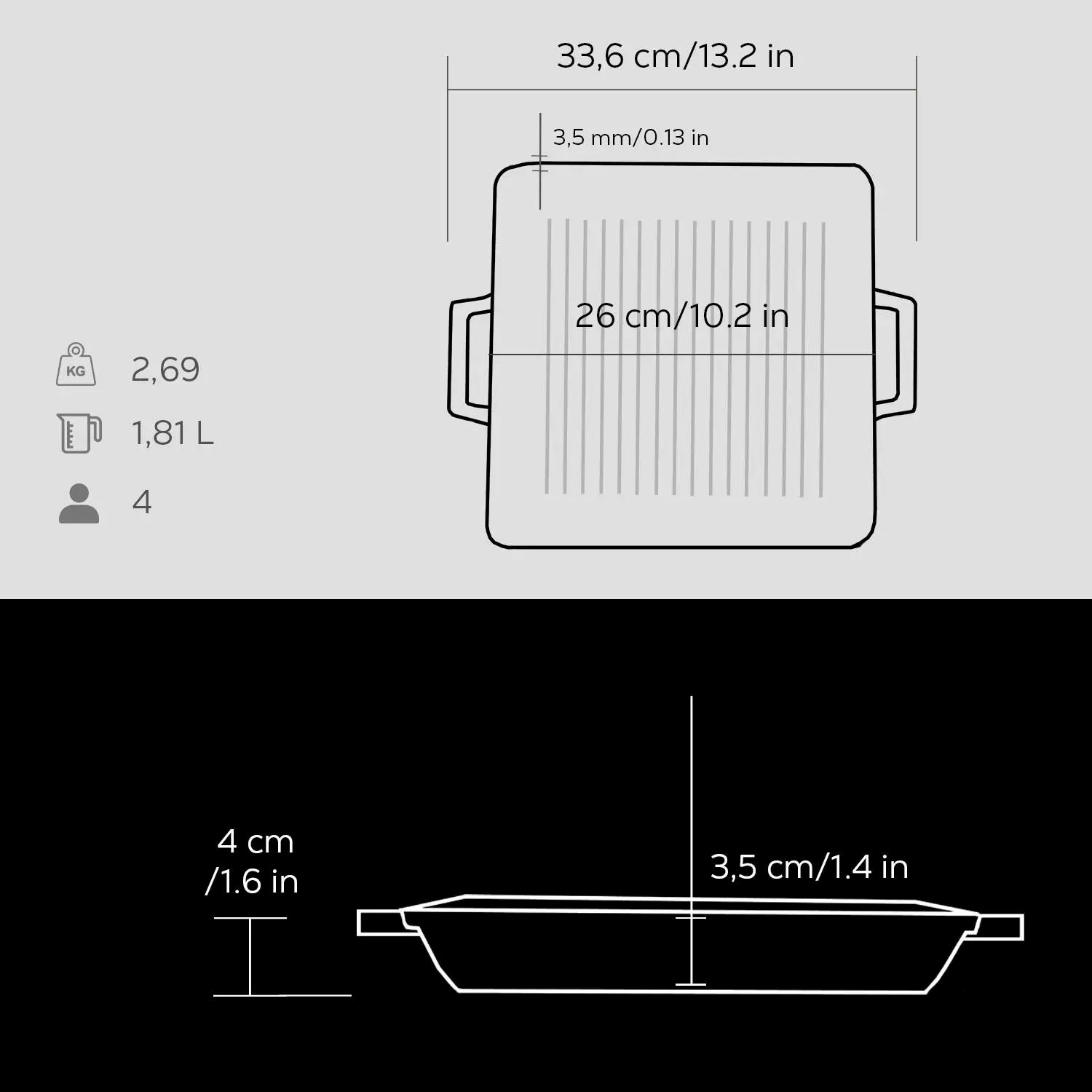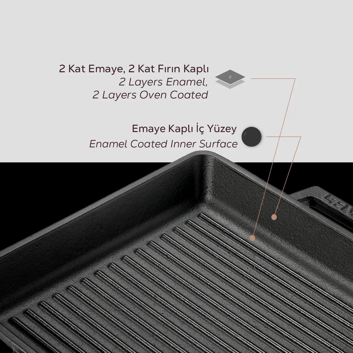 A tepsi falai 3,5 mm vastagok. A termék belsejét egy réteg fekete zománc borítja, amely elősegíti a tapadásmentes felület kialakulását zsíros sütés esetén.