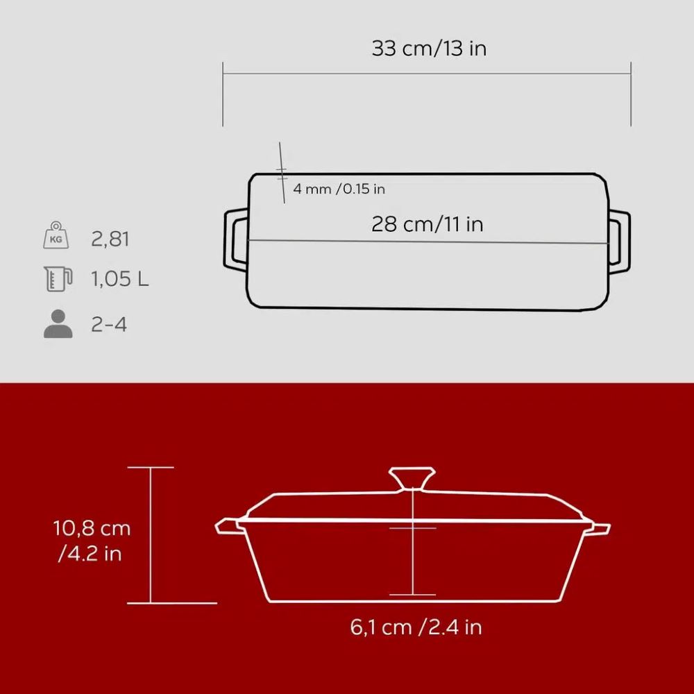 Lava márkájú terrine edény, anyaga öntvény, méretei 8.5 x 26.5 x 6 cm, űrtartalma 1 liter. Zöldségek, hal vagy kenyér készítésére alkalmas.