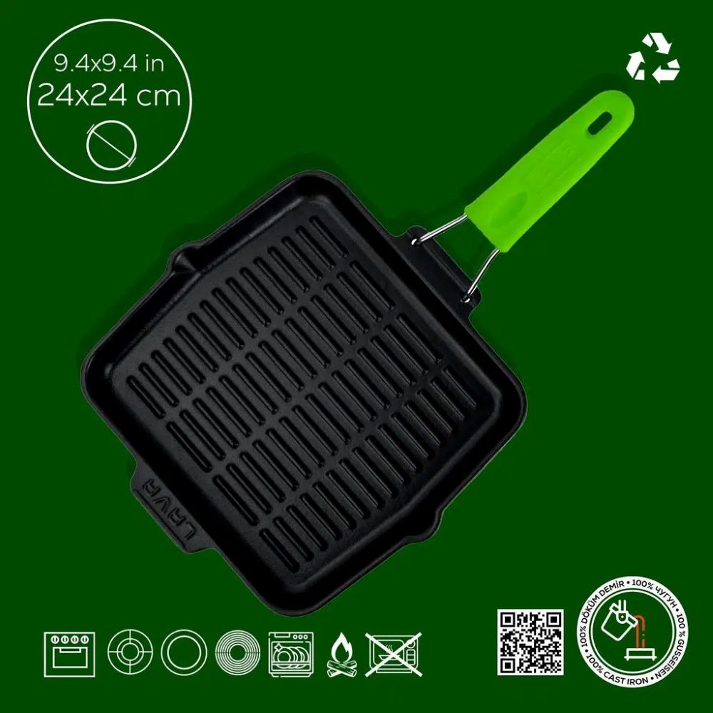 Szögletes grillserpenyő gyártója a Lava, méretei 24 x 24 cm, anyaga öntvény. Hőálló üveg tetővel van ellátva.