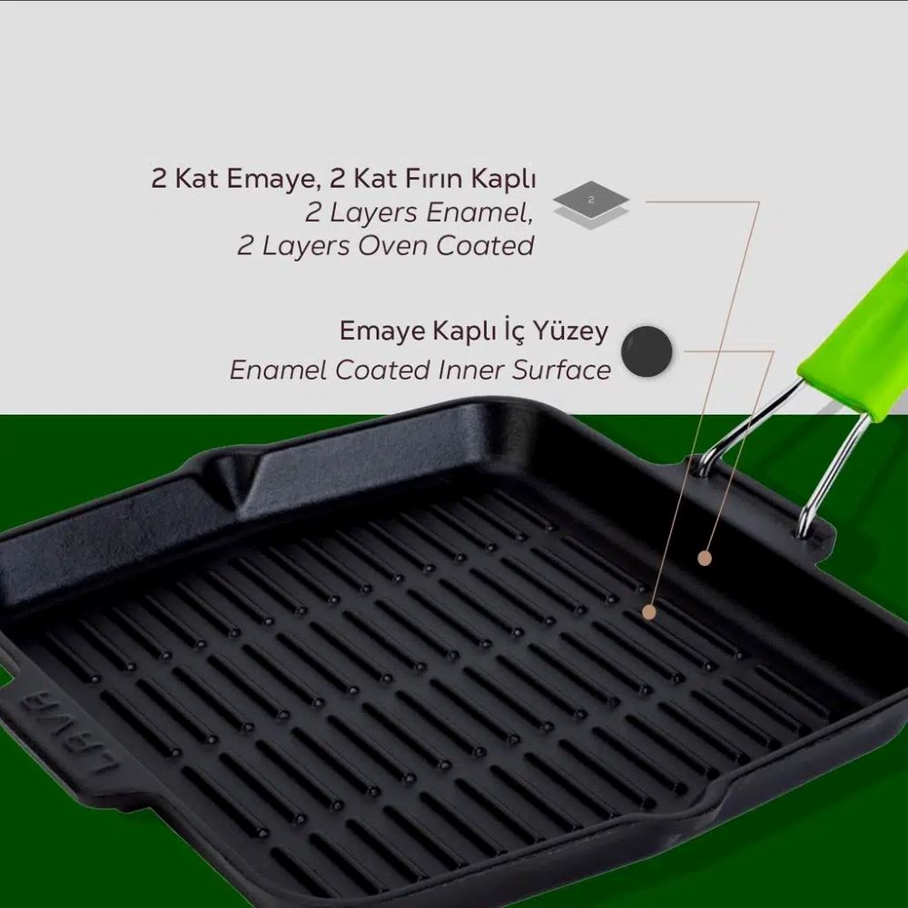 Jellemzők:A grillserpenyő falainak vastagsága 3 mm. Belül egy fekete zománcréteg található, amely tapadásmentes felületet biztosít zsiradékkal való főzéskor.