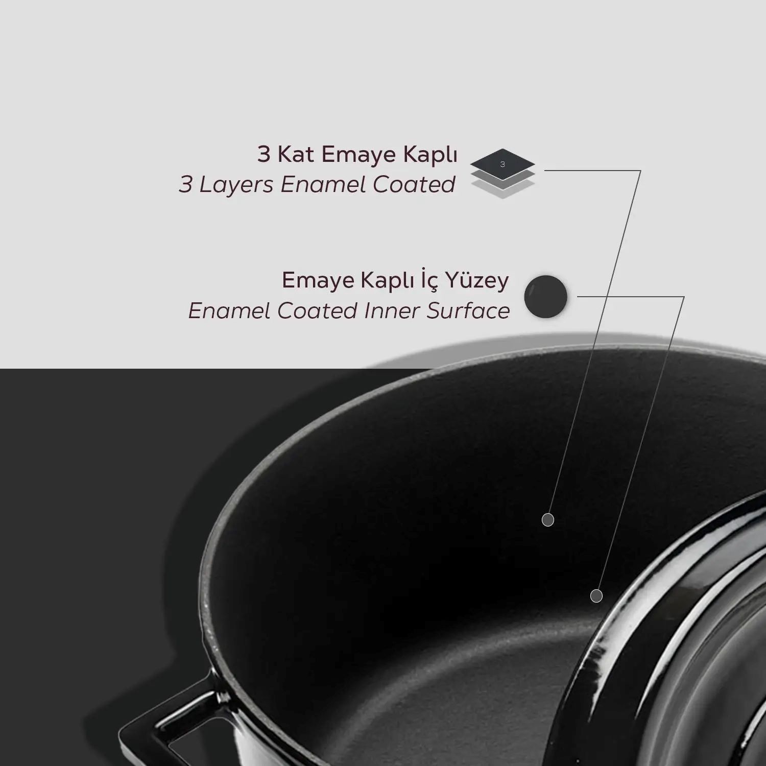 Az edény oldalának vastagsága 4mm. Az edény belső felületén egy fekete zománcréteg van, amely zsiradék használatával egy tapadásmentes réteget biztosít.