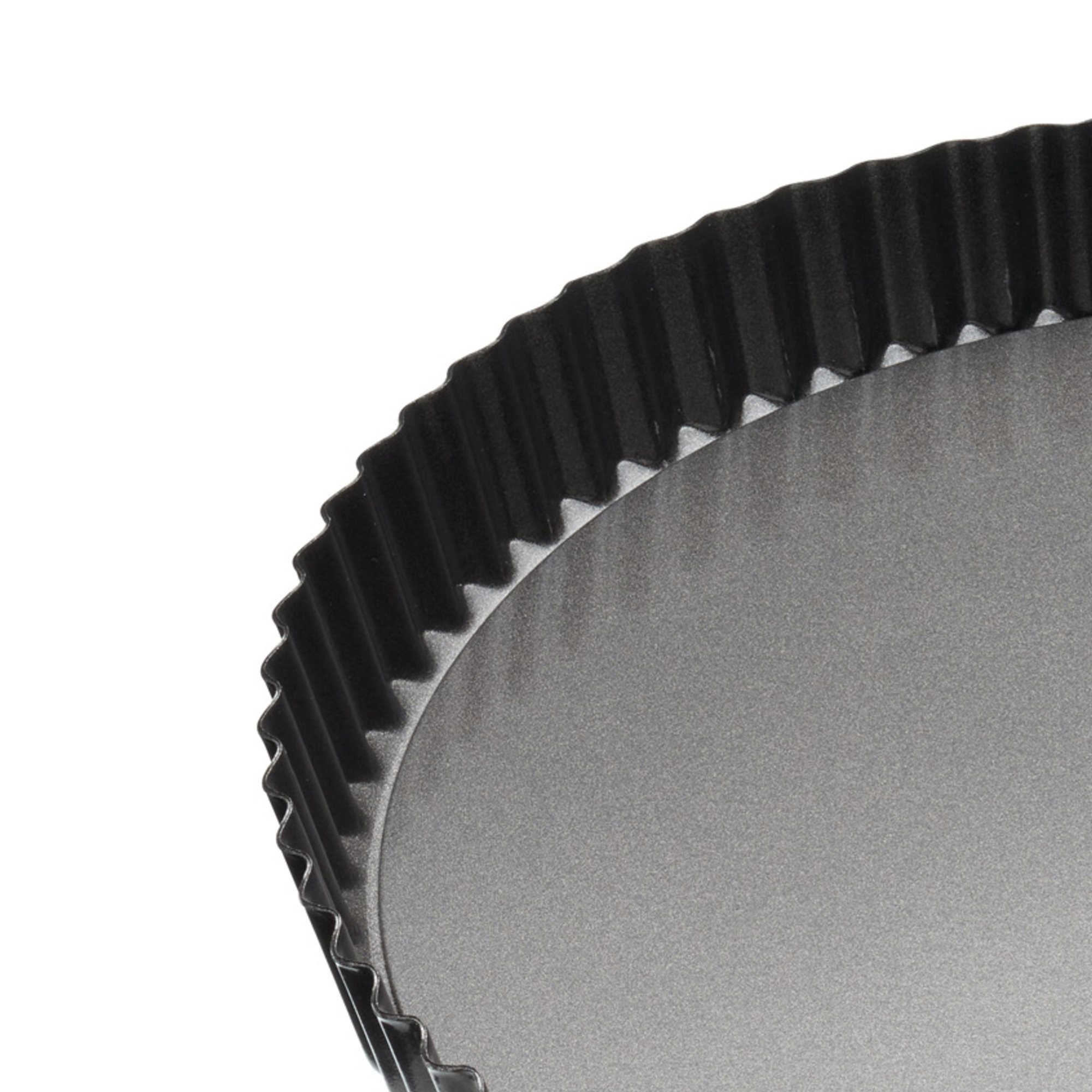 Az 1 mm vastag acél tepsi, amely tapadásmentes felülettel és lecsatolható aljjal és barázdált szélekkel rendelkezik, egyenletes sülést, könnyű kivételt biztosít. Átmérője 28 cm minden konyhai kihívásnak eleget tesz, "intenzív" használatra lett kigondolva.
