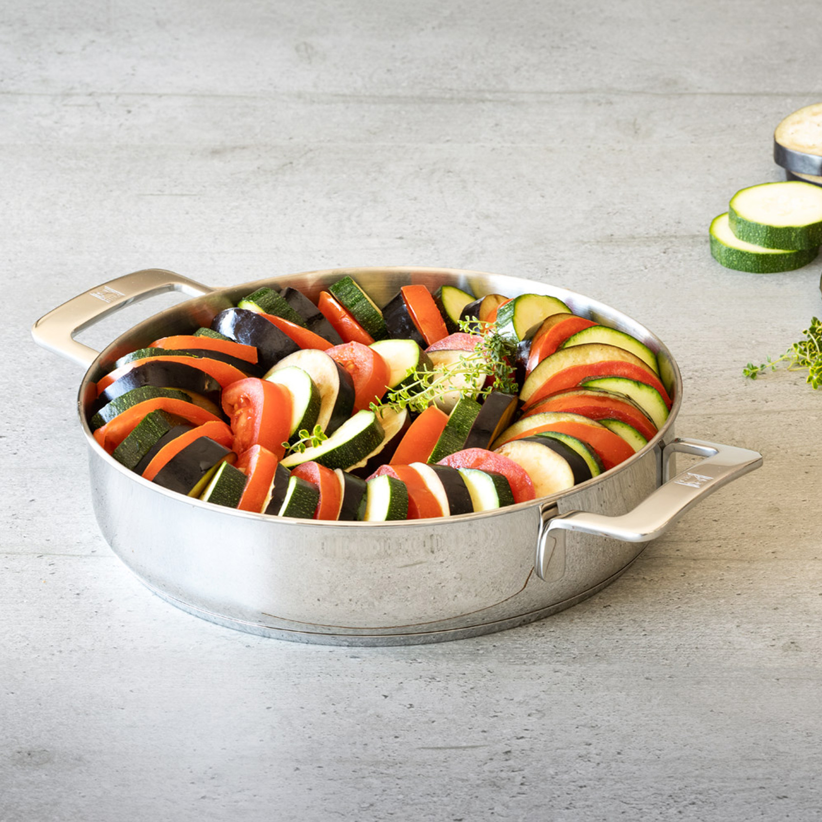 A Signature sekély tepsi elegáns és rendkívül funkcionális kialakítású, polírozott felülettel és ergonomikus fogantyúkkal a kényelmes használat érdekében.
