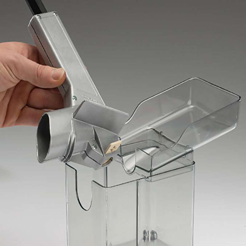 Fröccsenés elleni védelemmel, nagy kapacitású ferde csővel, kivehető maggyűjtő tartállyal és tartórögzítő rendszerrel rendelkezik.