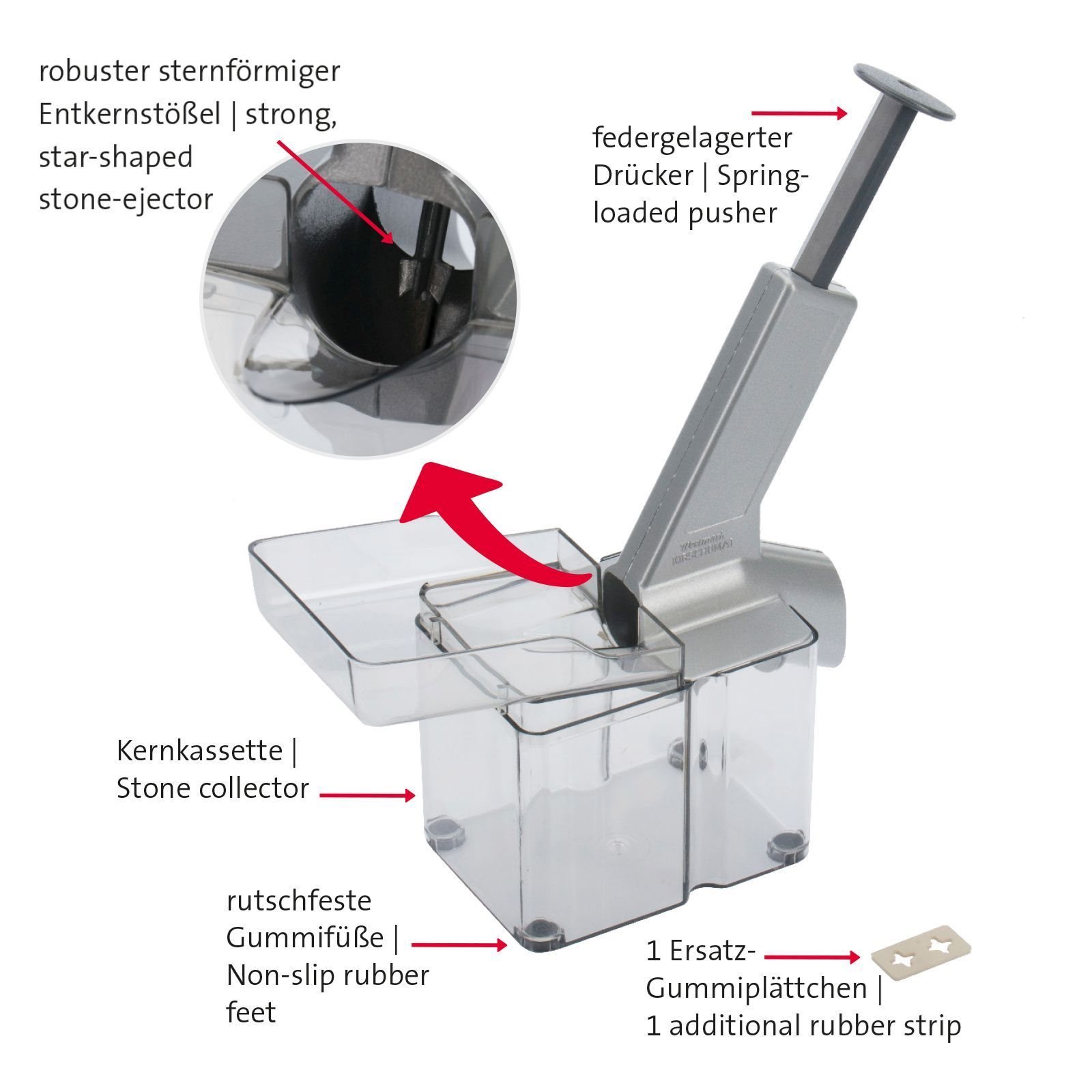 Speciális mechanizmussal rendelkezik a cseresznyemagok gyors eltávolítására (perforációval). Óránként több mint 15 kg cseresznyét tud feldolgozni.